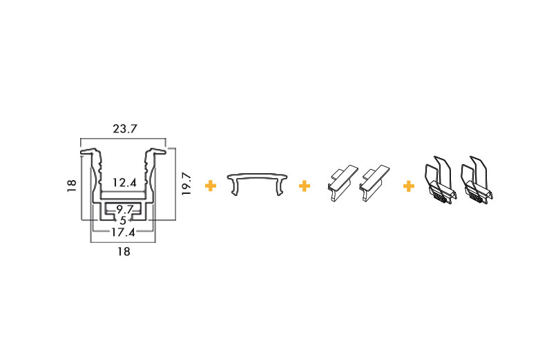 Set per montaggio ad incasso, può alloggiare strip LED IP20 o IP65 (verificare misure ed ingombri effettivi). SET COMPOSTO DA: - Profilo in alluminio estruso anodizzato da 2m - Diffusore opale - 2 tappi - 2 staffe a molla