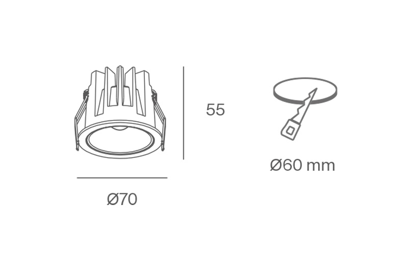 Apparecchio ad incasso per interni, a scomparsa per controsoffitti in gesso, telaio in alluminio. LED COB ad alto rendimento. Disponibile a 7W, 12W, 18W e varie colorazioni , CRI 90, lente 36° - Dimensioni per 7W: diam. 70xh55mm - Dimensioni per 12W: diam. 85xh65mm - Dimensioni per 18W: 90xh80mm. Colorazioni interne disponibili: Bianco, Cromo, Nero, Oro, Rame