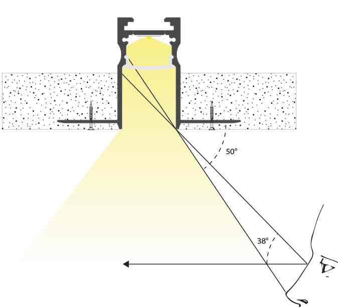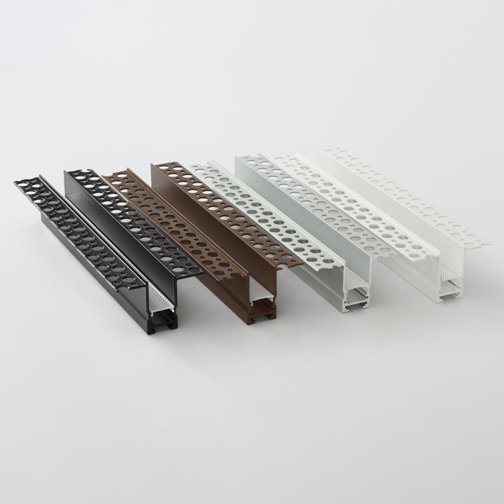 Profilo in estruso di alluminio anodizzato e ottica arretrata per cartongesso. Installazione ad incasso soffitto e parete a scomparsa totale, con alette di fissaggio poste alla base per facilitare la posa e la rasatura. Ideale per realizzare linee continue di luce perfettamente intregrate nei muri